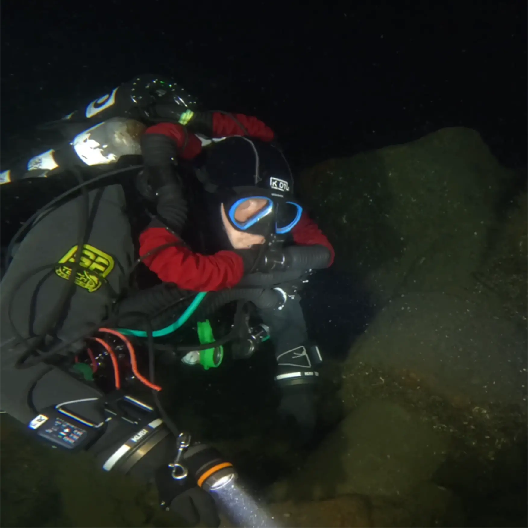 The information from the Royal Navy archives and the sonar scan of the bottom clearly indicated that we were descending to UC-55. But still, I had an adrenaline rush and a curiosity to see what condition the submarine was in after 106 years of not being seen by the human eye. The descent down the rope was not so idyllic and the considerable current that tilted the descent rope extended our descent to 105 meters. The middle part of the descent in particular seemed interminable, the daylight had already completely disappeared and our torches were still not reaching the bottom. We were "kicking" against the current. And suddenly we see her !!! Quickly place the strobe light on the rope, turn on the camera and video lights and hurray to discover.