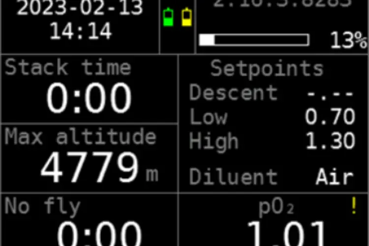 Alarms – displayed in case of a dangerous situation such as exceeding the ppO2 limits, exceeding the decompression ceiling, etc. It is displayed by repeated red flashing of the display. At the same time, the value that was exceeded is highlighted. The warning is accompanied by a pop-up message.