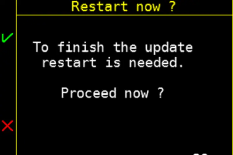 Third phase begins with a queue for user to confirm the restart, after which the Liberty reboots into a bootloader mode and proceeds with the update. If you "deny" the restart, the update will take place the soonest you remove and replace the battery jumpers (eg. when charging).