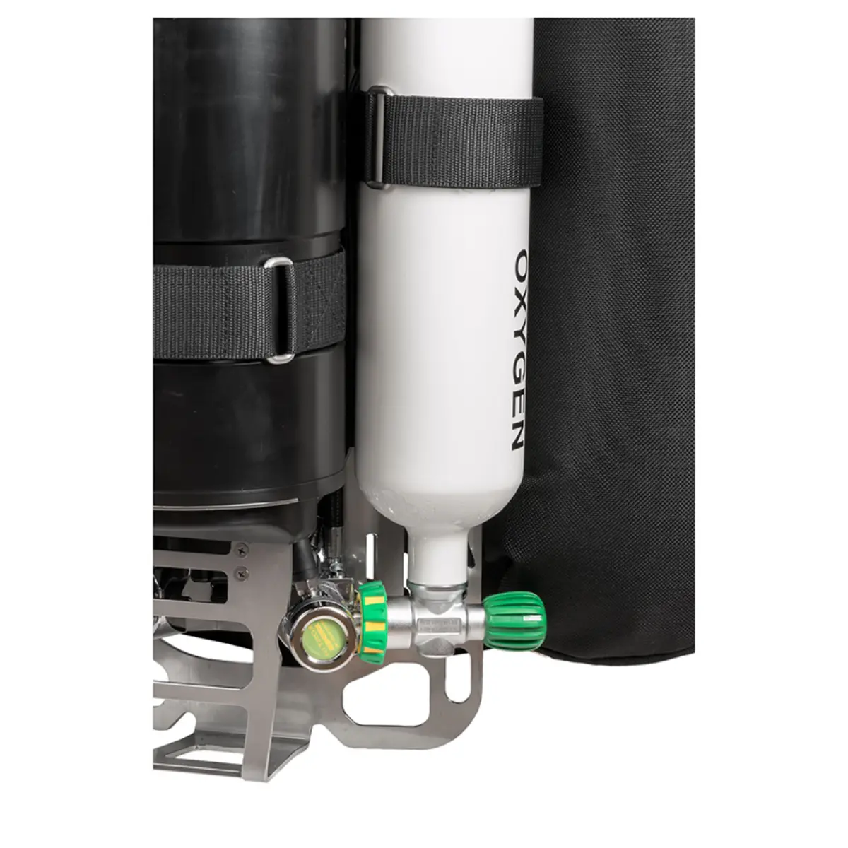 The cylinder is labeled OXYGEN and is situated on the diver´s right side when wearing the CCR Liberty.