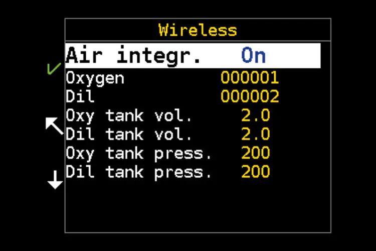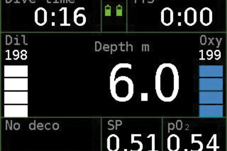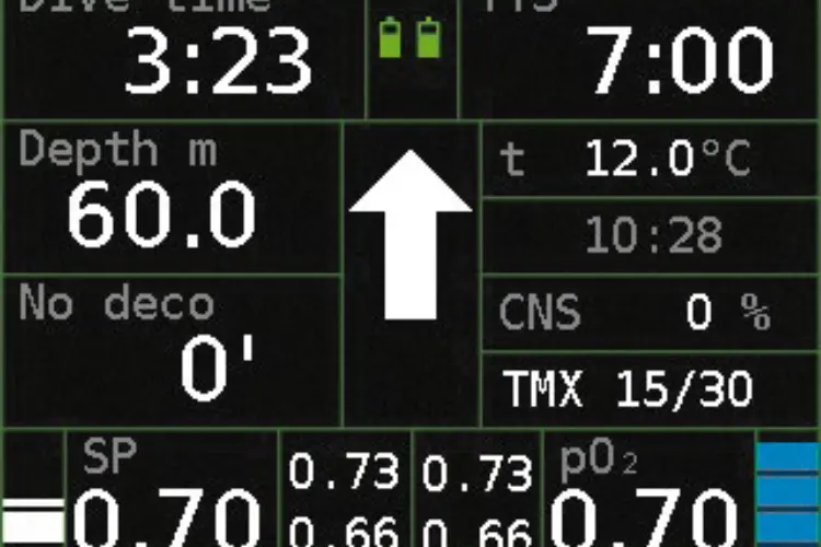 The 2021 Edition Liberty features wireless cylinder pressure readings for both oxygen and diluent cylinders and one bailout mixture. In this case, after setting this option and placing pressure transmitters on the first stage regulators, it is possible to display the cylinder pressure on the handset display.