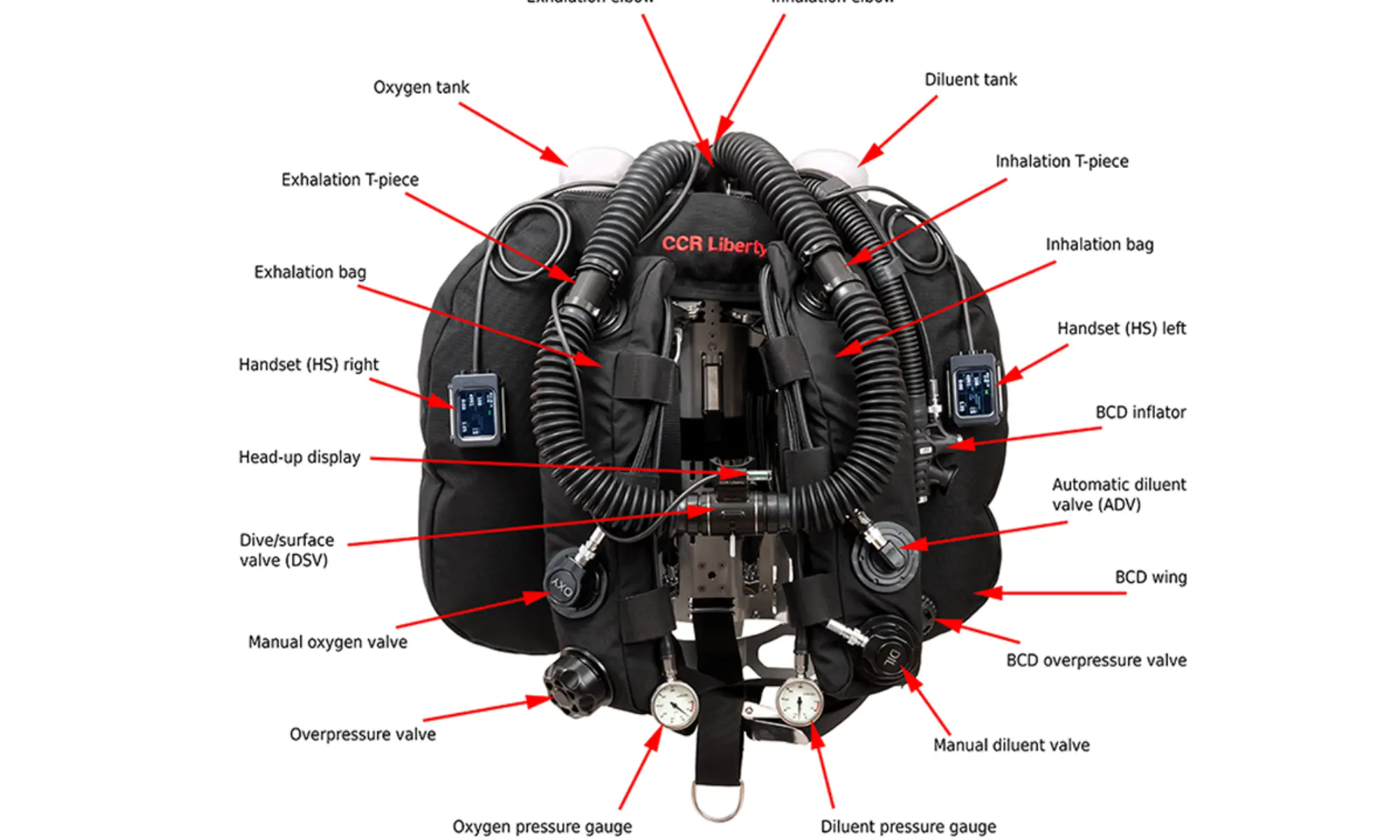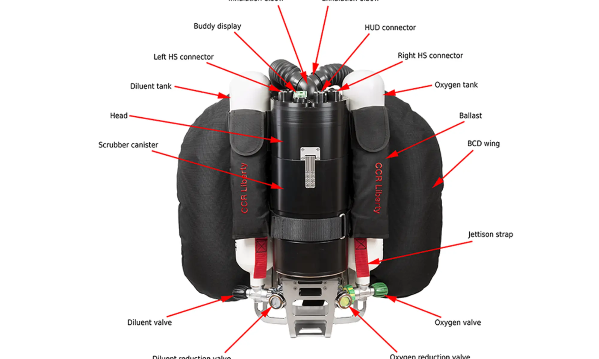 The method of mounting the CCR Liberty on the diver’s body is based on the backplate and harness common among wing-type buoyancy compensators used in technical diving.