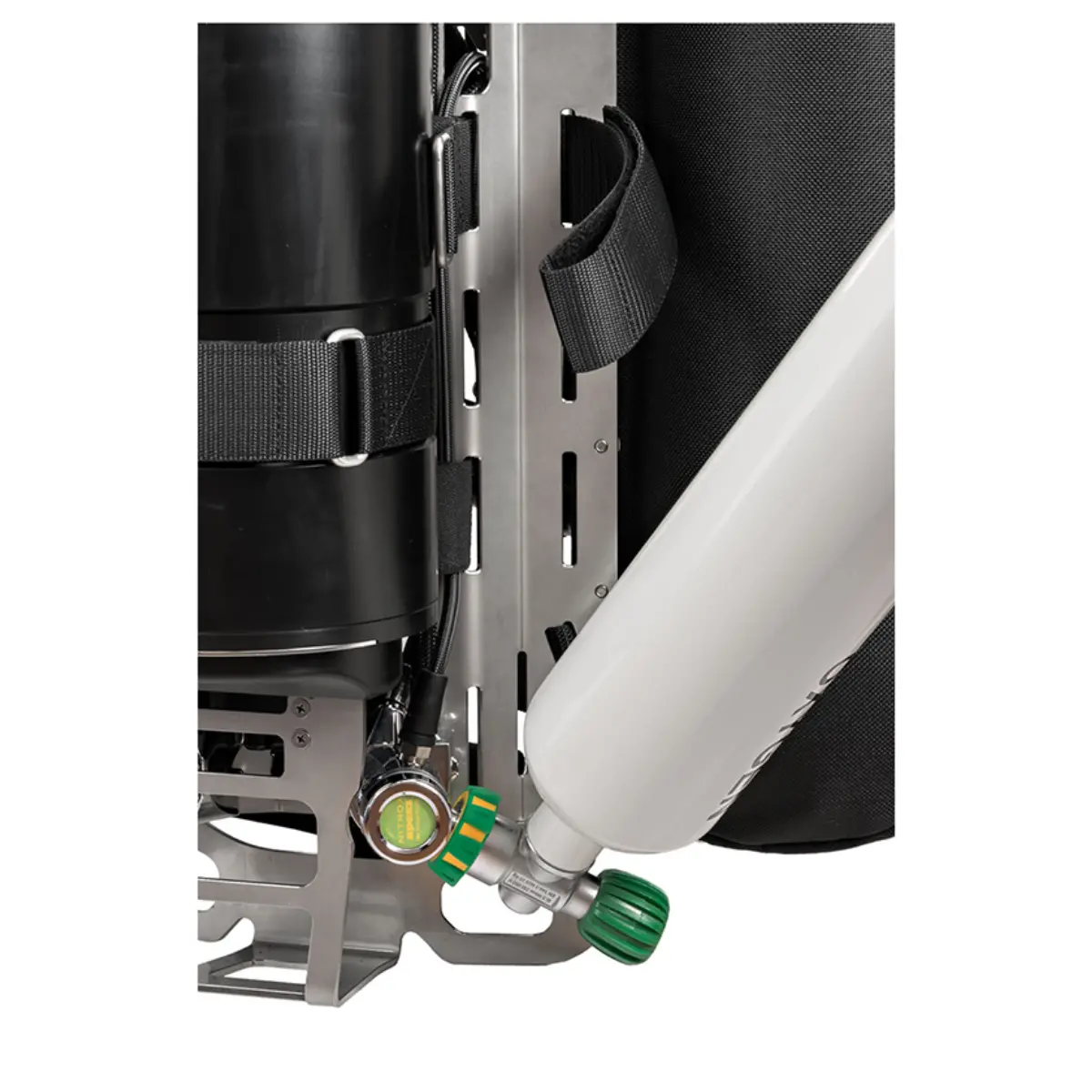 If needed, it is possible to remove the CCR Liberty’s backplate, and use it with a harness for open-circuit diving. The backplate enables the attachment of a twin-set (two cylinders firmly connected with stainless steel bands) commonly used in technical diving, as well as attachment of a single cylinder.