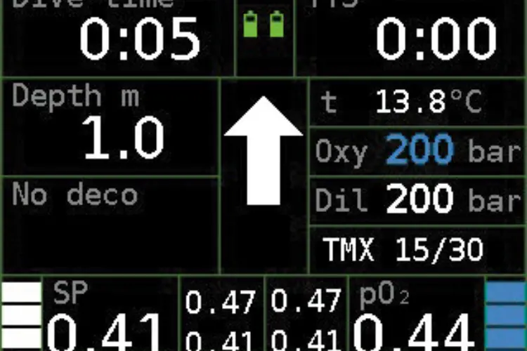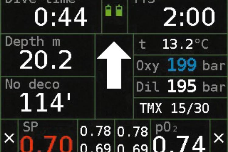 The head-up display (HUD) shows the current partial pressure or CCR error status during the dive.