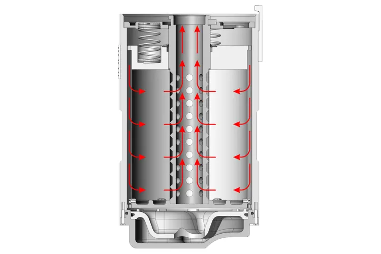 The baskets of the mushroom valves are inserted into the connector. When handling the baskets, pay close attention to their correct orientation.