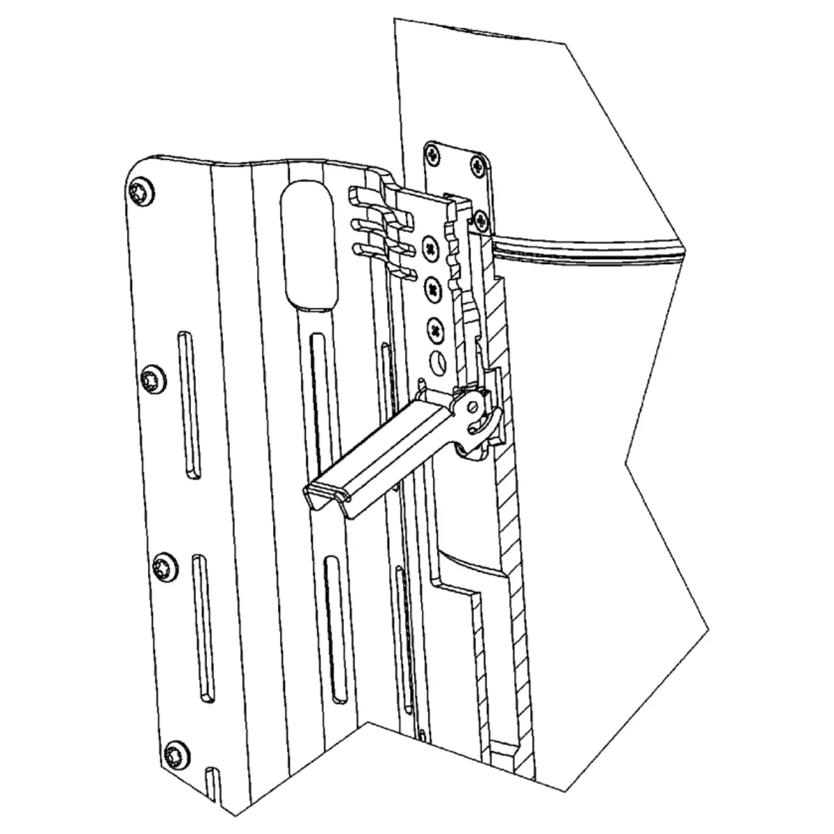 The body of the rebreather, comprised of the scrubber canister and the attached head is mounted to the backplate with a cam. The cam lever cannot be released when the diver is wearing the rebreather.