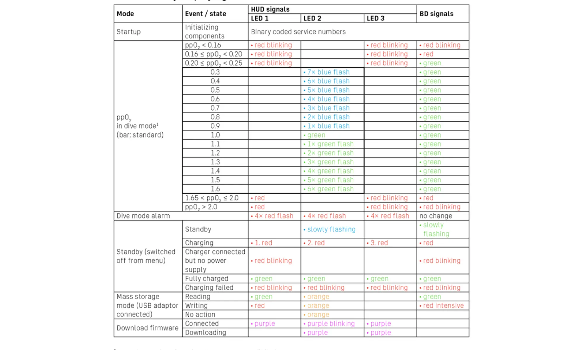If you cannot distinguish blue and green LED lights, check “Color blind mode” in Setup / Preferences / Indication. Signals for 1.05 ≤ ppO2 ≤ 1.65 will be changed according the following table:
