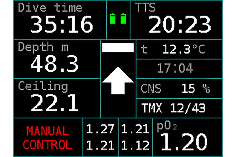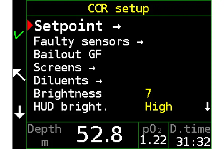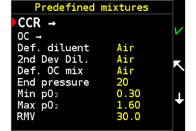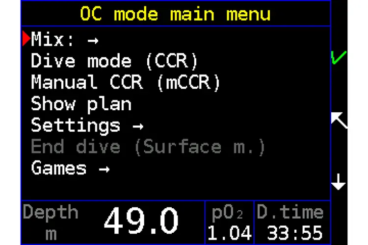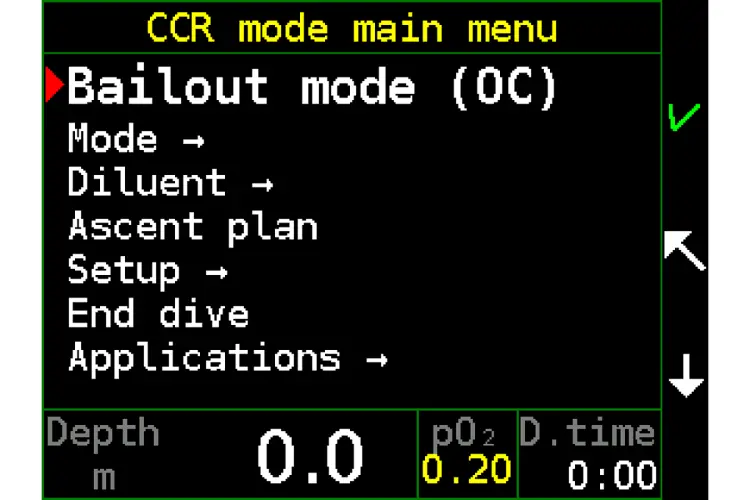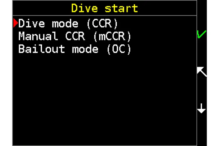 In the menu the user can switch from surface mode to the CCR, manual CCR, bailout and standby modes.
