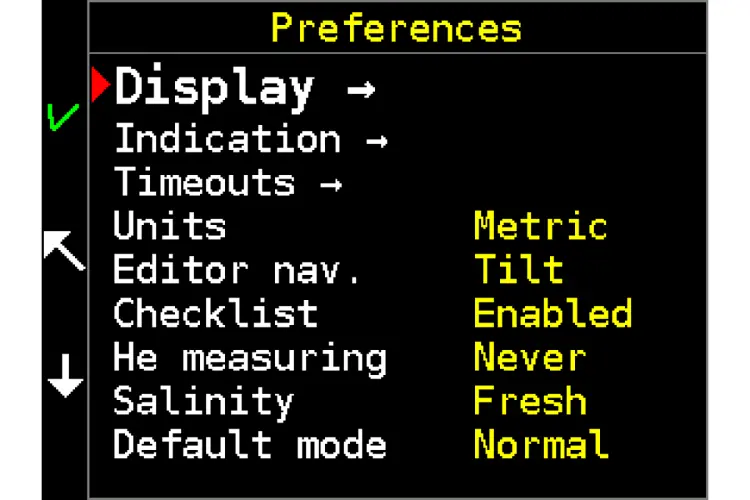 The CCR Liberty is configured in surface mode. Activate the surface mode main menu with a short press of both keys and select Setup.