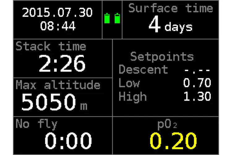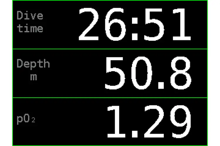 To switch between the different screens in surface mode, press the top button. Both ppO2 and sensor voltage can be read. If a sensor is not an operational state (not connected, offline, error, excluded, disabled, uncalibrated), the appropriate tag appears instead of the ppO2 value.