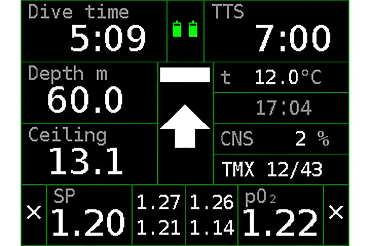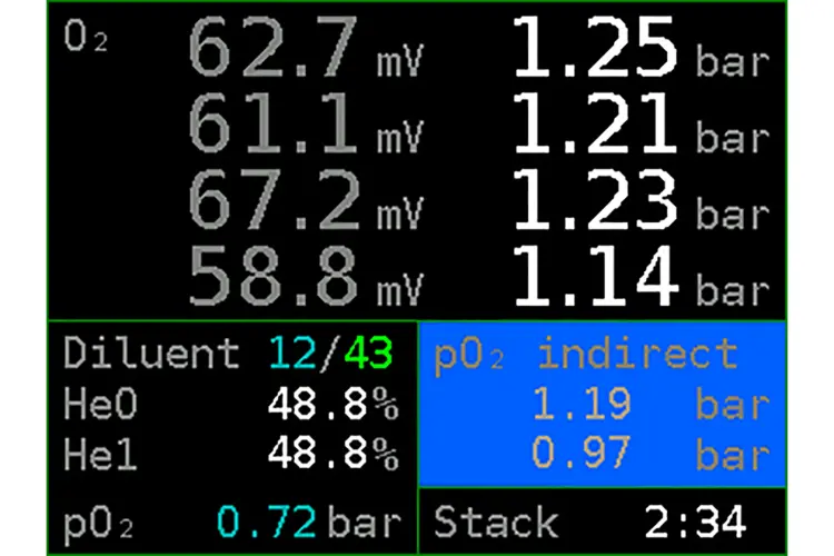 If you are using trimix as a diluent, and have helium sensors in working order, then you can manually switch to the backup computed ppO2 reading using helium sensors. The “pO2 backup mode” notification will follow, and all ppO2 values will have a blue background to signify that they are not from the chemical oxygen sensors.