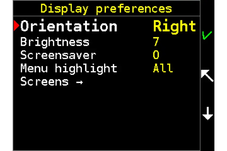 The |↓| symbol indicates the user can scroll through the menu. Scrolling in the menu is cyclical, so the cursor will return to the top of the menu list. A scroll-up function is not available due to the two-key control.