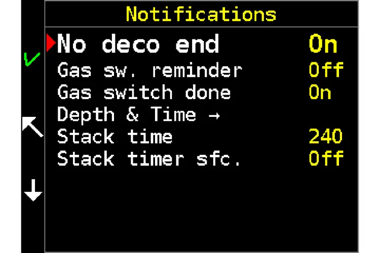 Setup / Alarms / Notifications / No deco end [On]