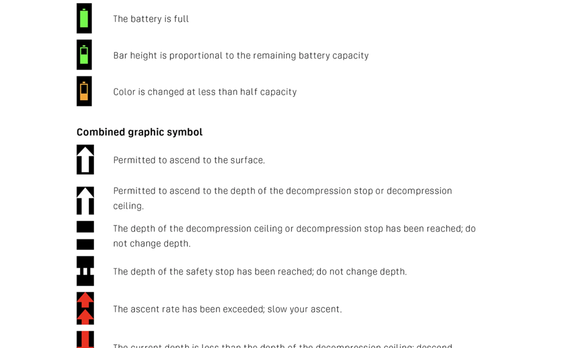 Automatic activation occurs in the event the units is submerged to a depth greater than 1.5 m. In such a case, the user cannot continue the dive, and must perform complete pre-dive preparation on the surface as soon as possible.