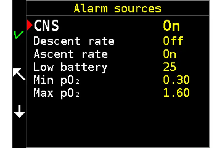 Setup / Alarms / Alarm sources / Ascent rate [On]