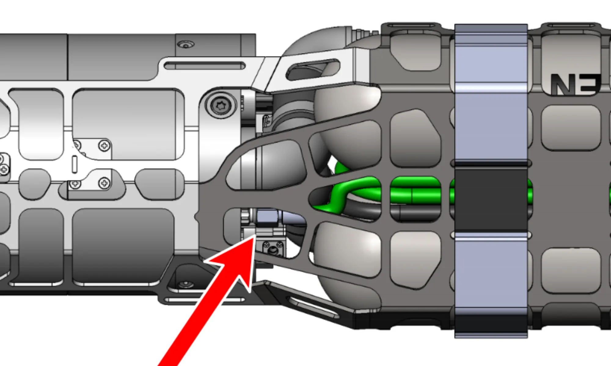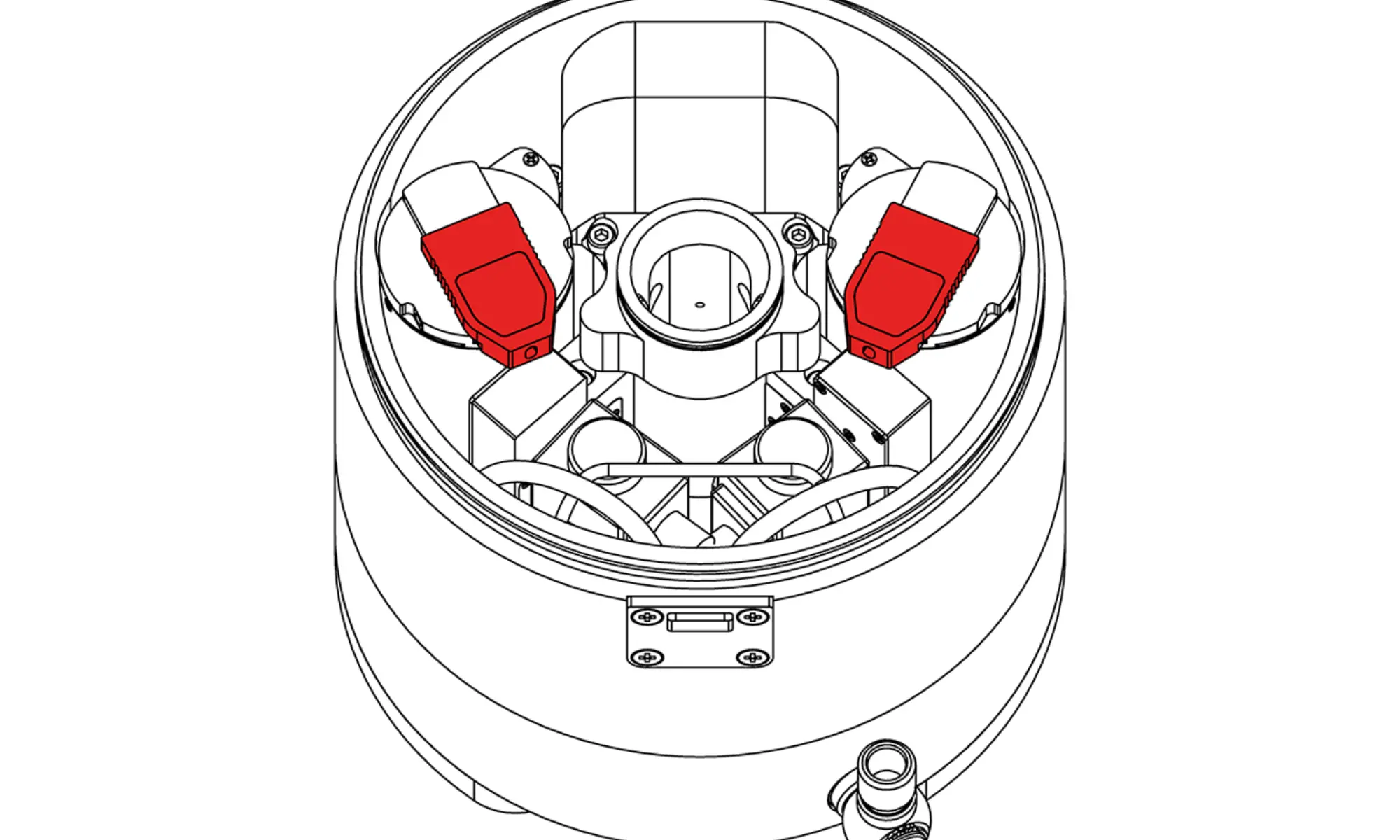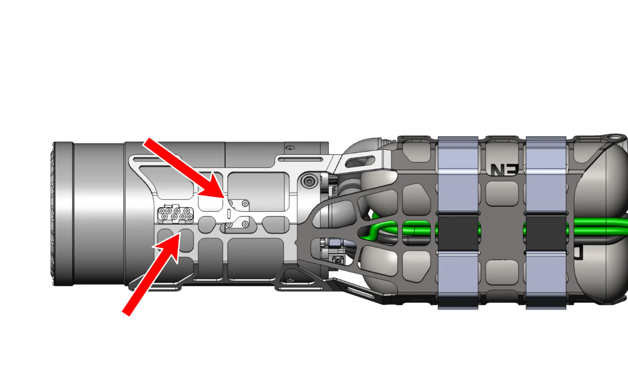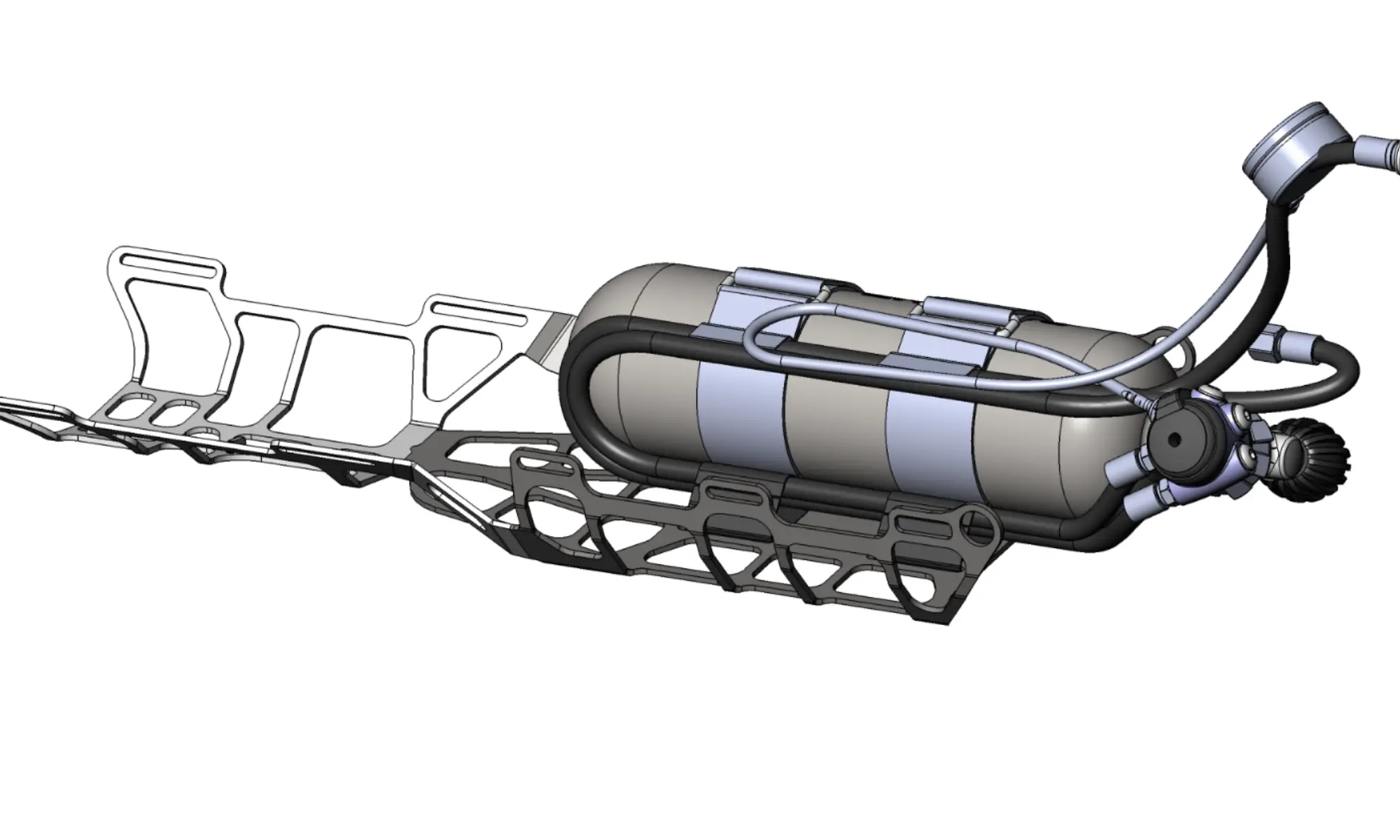 The unit carrier is an open structure designed to connect and carry the individual parts of the device. Design is made of titanium and relieve cut-outs in order to achieve neutral buoyancy. At the front of the carrier there are anchors on both sides for attaching a carabiner, in the area where the pressure cylinders are fastened are points for securing the counterlungs. The straps for fastening the head and the canister can be found in the back of the unit. The carrier also allows for optimal routing of the high and middle pressure hoses.