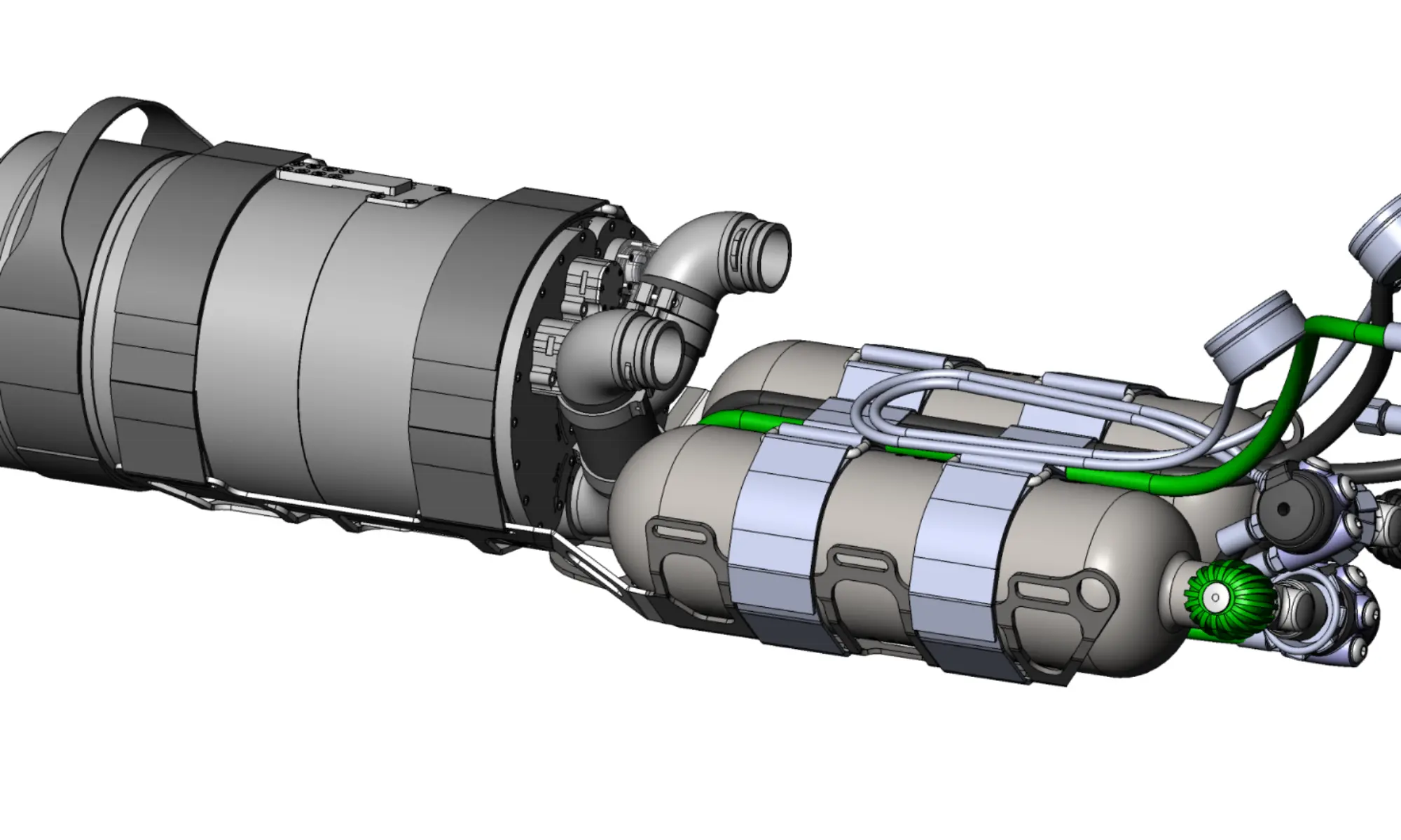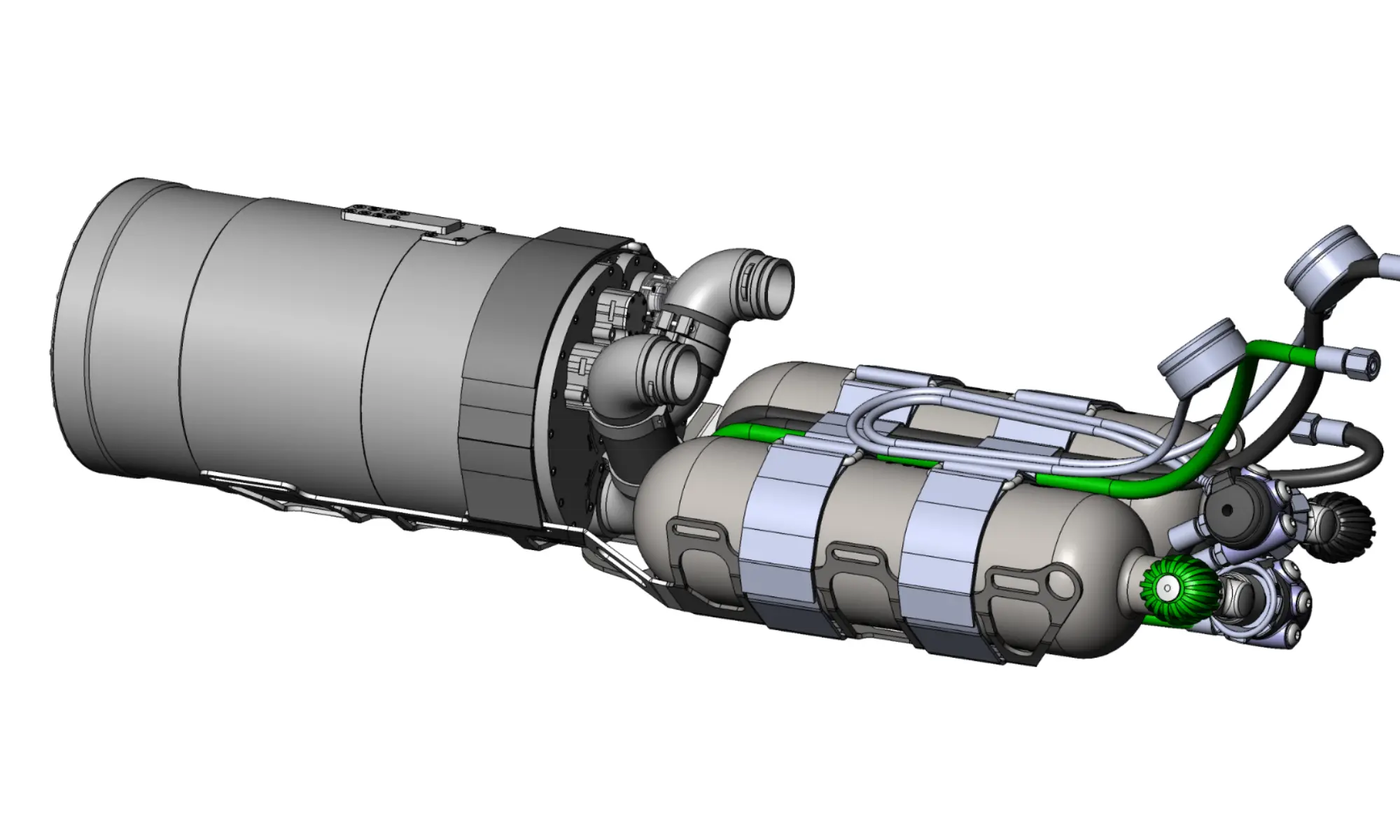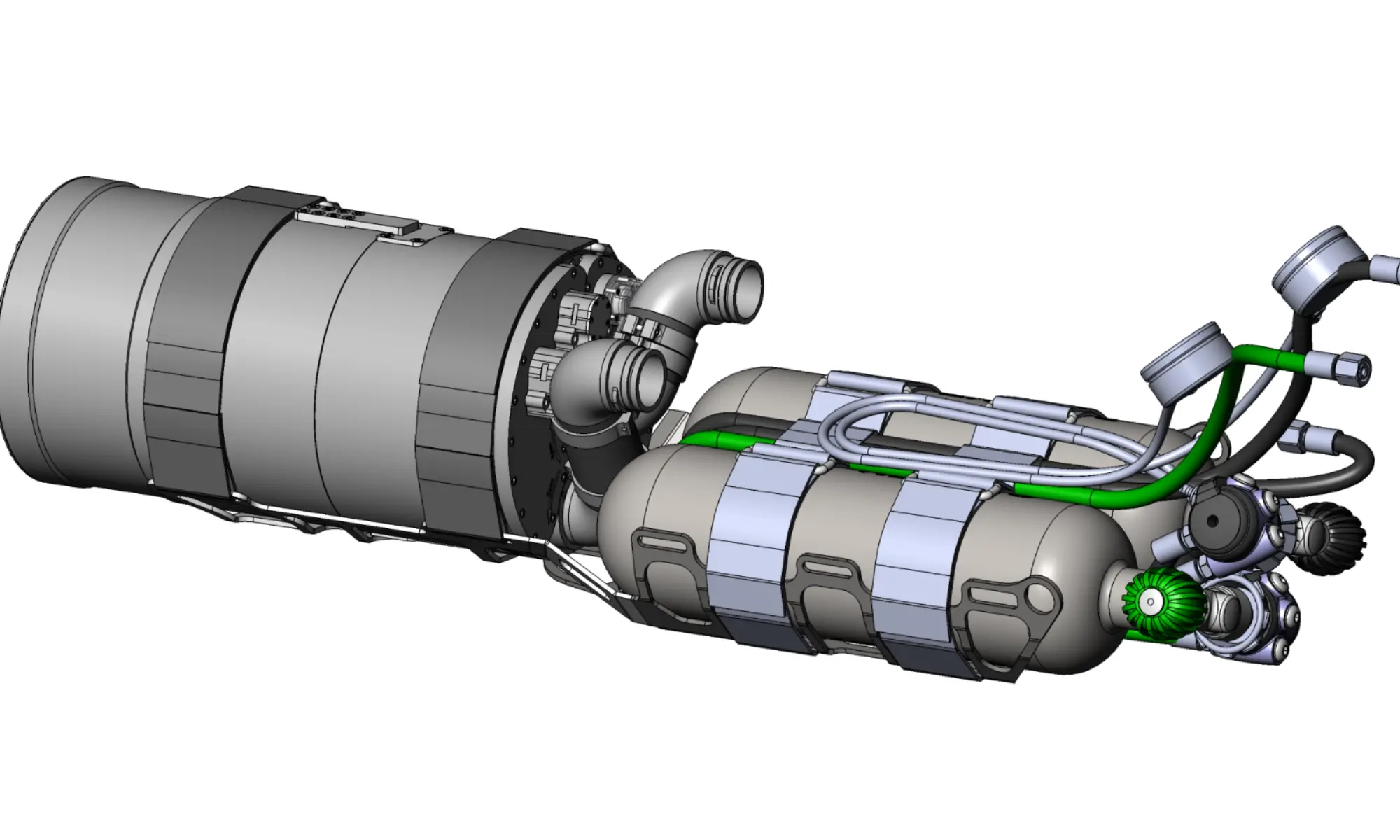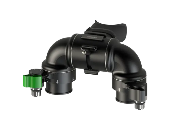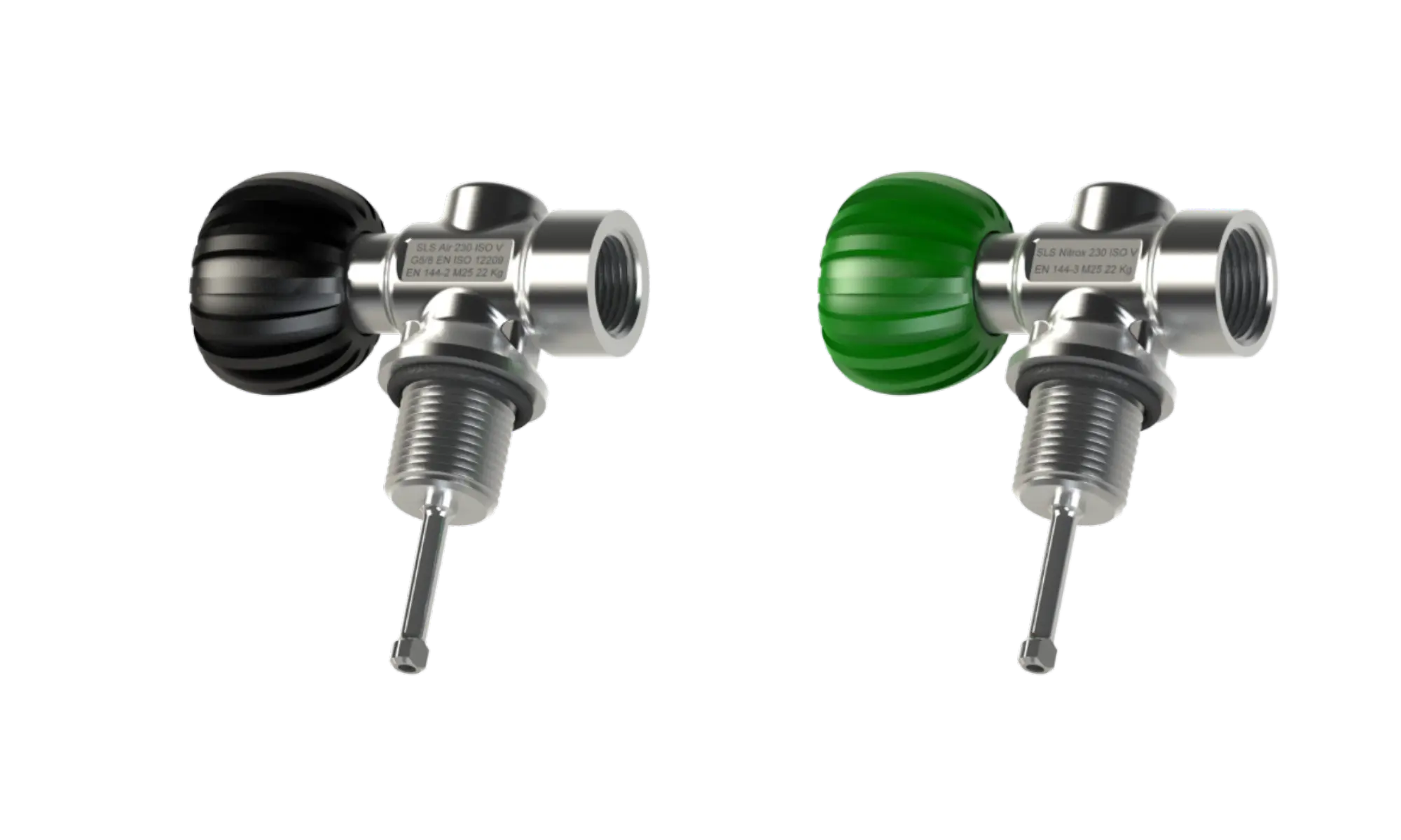High-quality valves for diluent (black knob) and oxygen (green knob). In the US, the valves are equipped with a burst disc. The thread for the diluent valve is DIN G5/8. Thread for oxygen valve is M26x2. For units supplied outside the European Union and the United Kingdom, identical valves for both cylinders can be ordered.