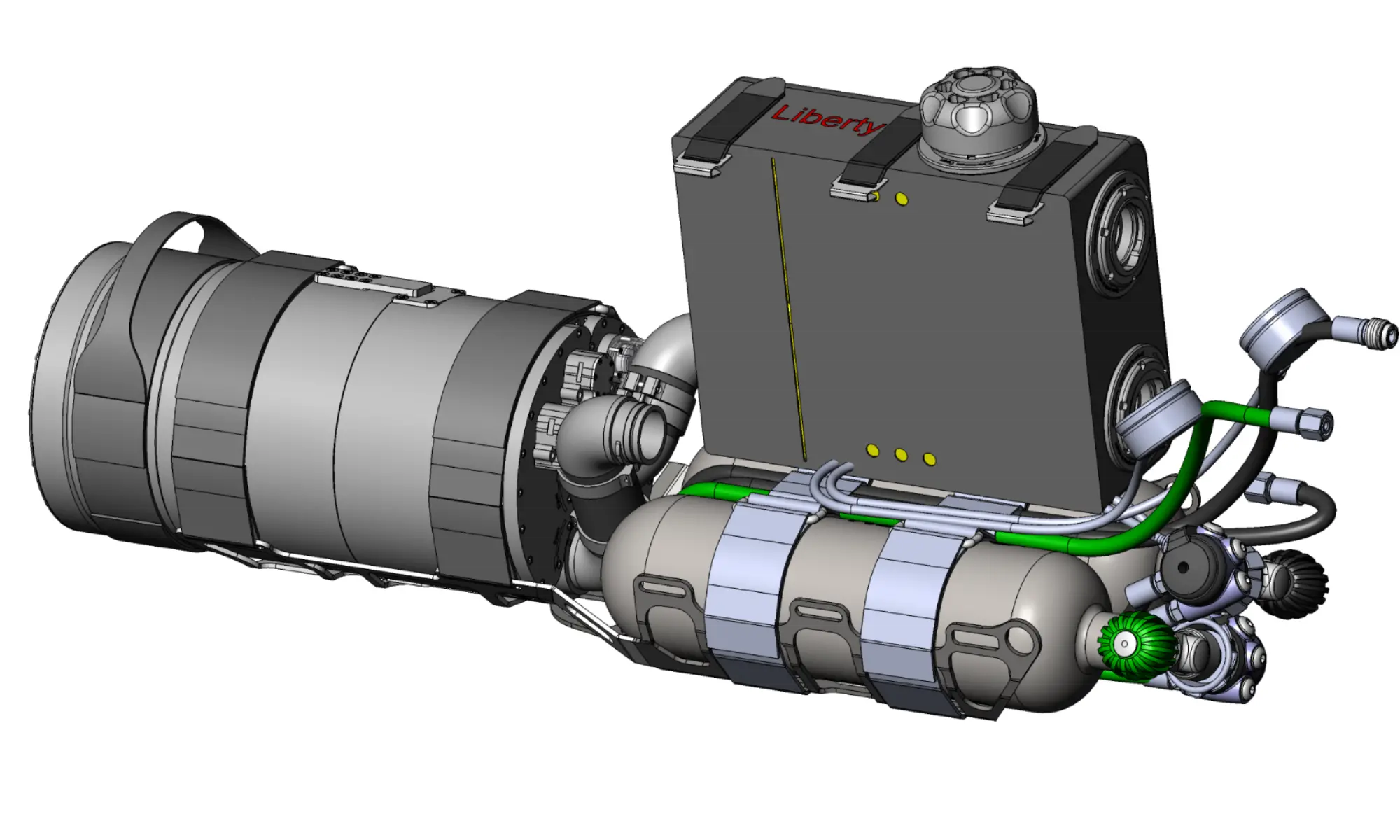 Sidemount Liberty Rebreather is a modification of the original Liberty Rebreather. Liberty Sidemount retains the complete head of the device including electronics, handsets and all sensors. However, the device configuration is designed to be worn on the side. This allows the device to be used in low-ceiling areas such as caves or wrecks.