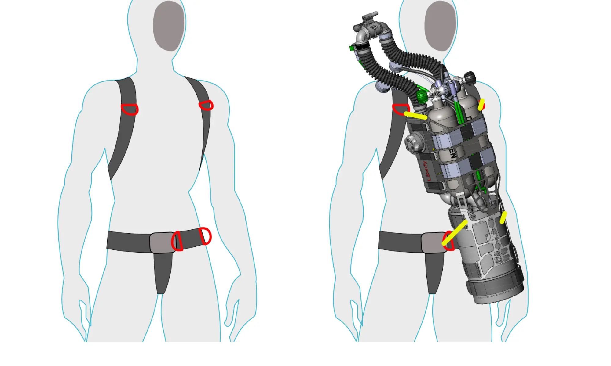 A properly fitting sidemount harness is required to attach the device. A minimum of 4 D-rings is required. Two in the normal position of the shoulder straps and two asymmetrically positioned on the belt portion of the harness. NOTE: Both D-rings on the belt are on the left strap (without buckle). The right belt D-ring should be positioned so that it is almost at the belt buckle of the harness. The right D-ring should be placed approximately at the side seam of the imaginary pants (same position as the OC gauge D-ring on a regular OC setup).