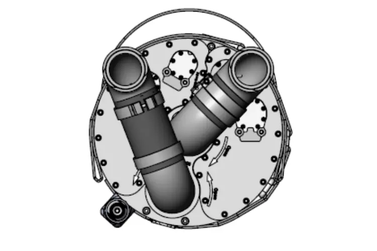 First place the counterlungs on their side so that the OPV is up and towards the front. Connect the left short hose to the bottom port of the counterlung. Tilt the counterlung to the right so that the OPV is on the right and the embroidered logo is at the top. Attach the second hose (it is necessary to turn the port slightly away from you).