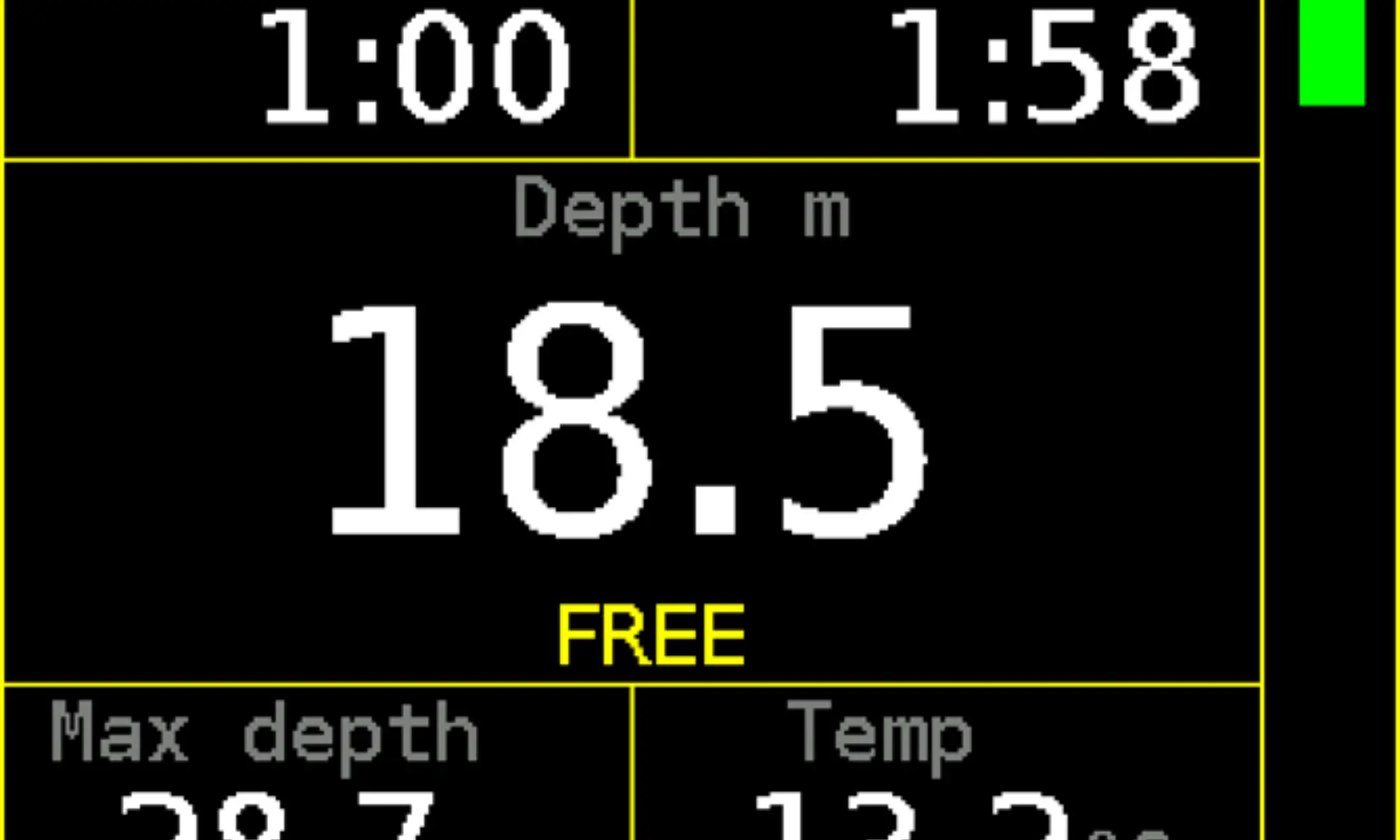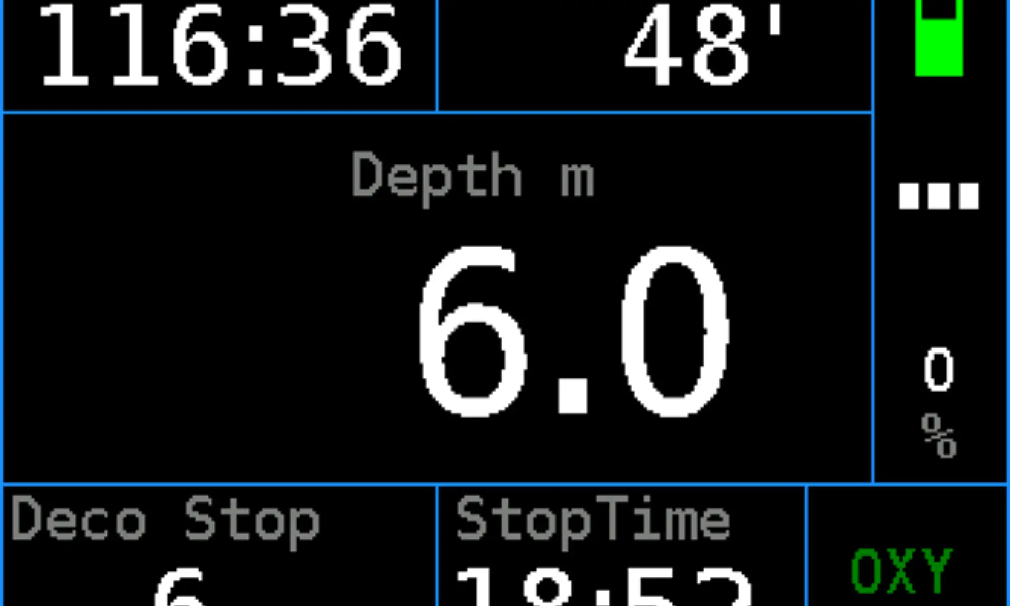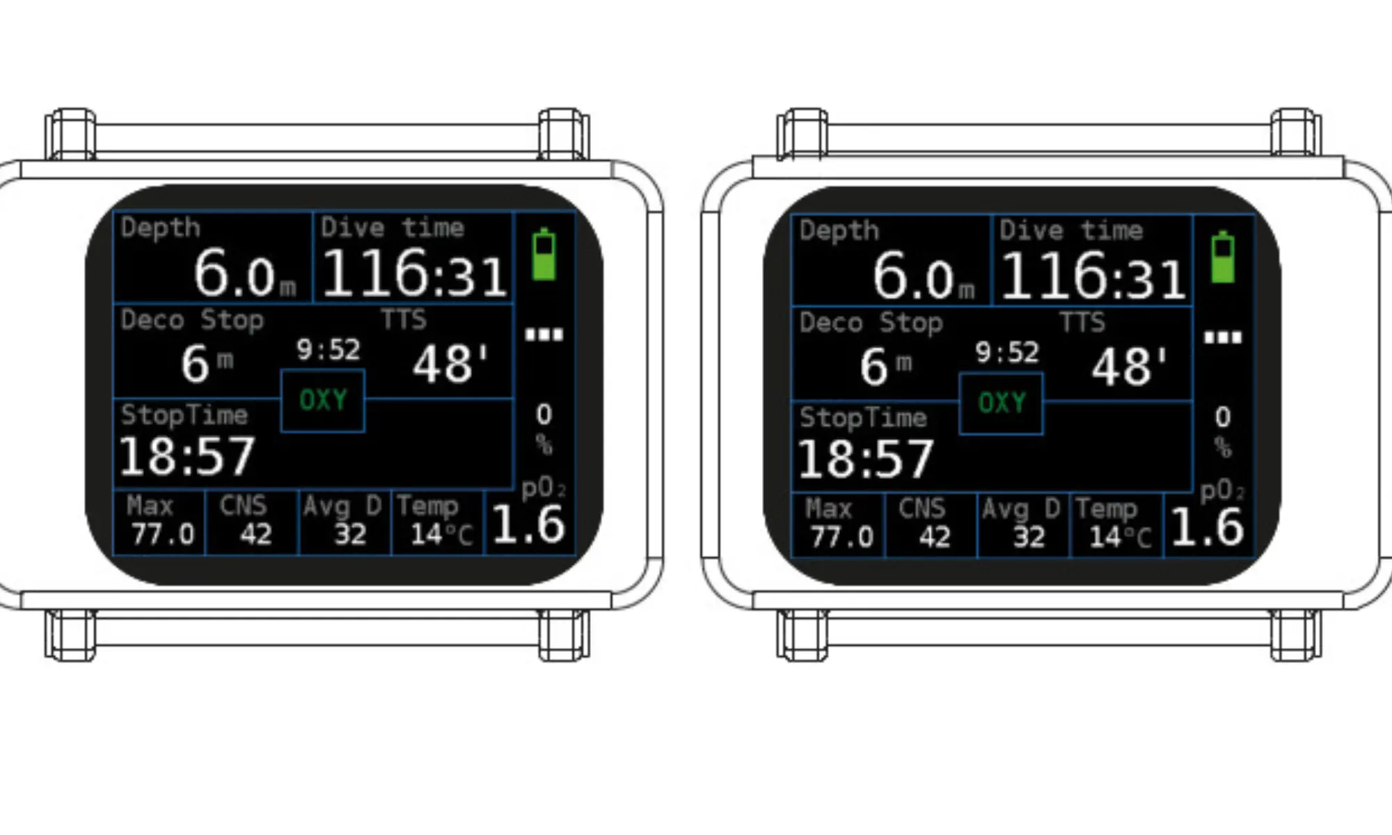 Gauge, Freediving, OC up to 9 mixtures (Air, Nitrox, Trimix), upgrade to CCR (all in one hardware) Alarms: vibration + visual (colour indication) - strong vibrations can be felt even in a dry suit