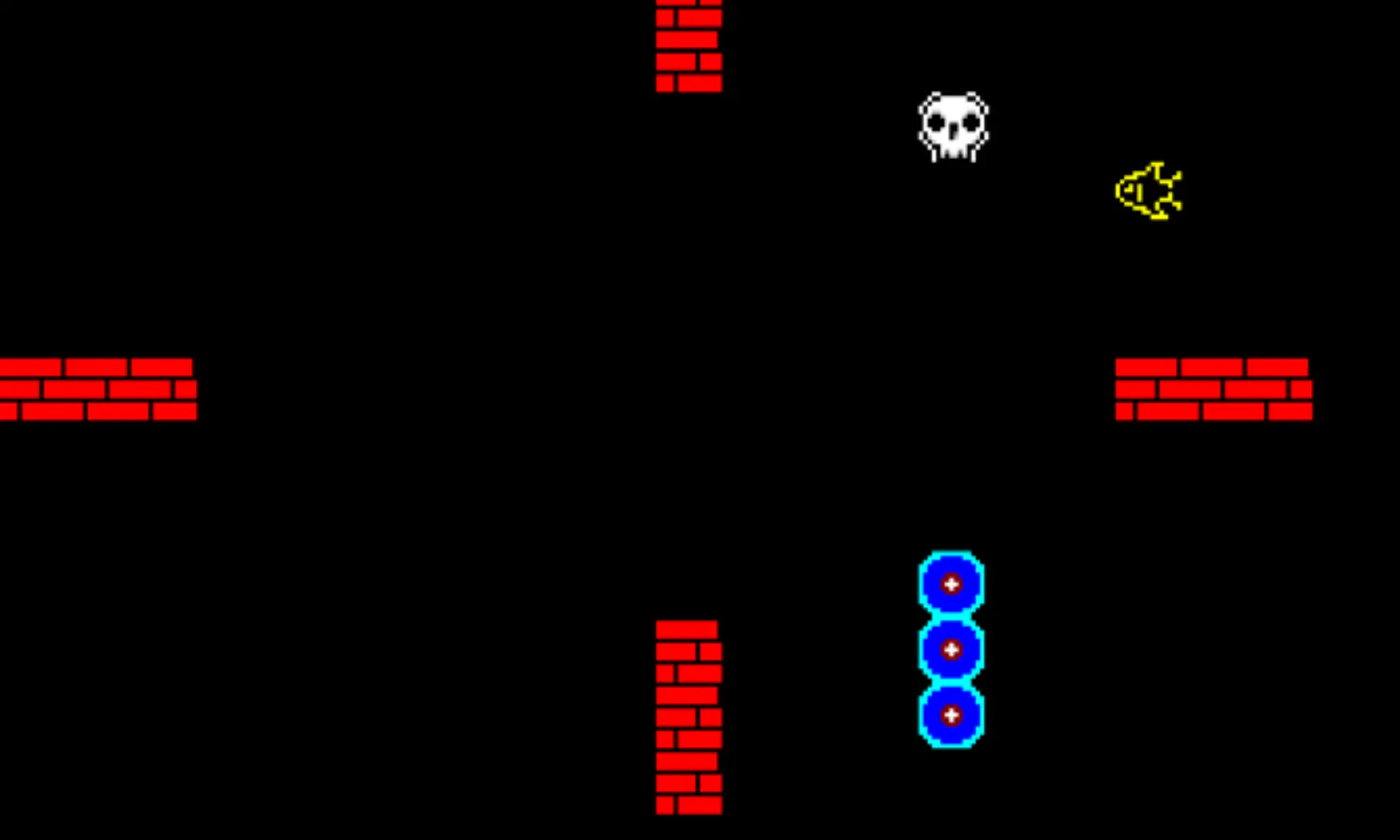 Snake is a game where the player maneuvers a line which grows in length, with the line itself being a primary obstacle. The player controls the head of the snake. As it moves forward, it leaves a trail behind, resembling a moving snake. The snake has a specific length. The player loses when the snake runs into the screen border, a trail or another obstacle, or eats poison (skull), or starves to death. The snake lose its length slowly (every 30 steps), and when it is too short, it dies from starvation. The player attempts to eat fish by running into them with the head of the snake. Each fish eaten makes the snake longer, so maneuvering becomes progressively more difficult.