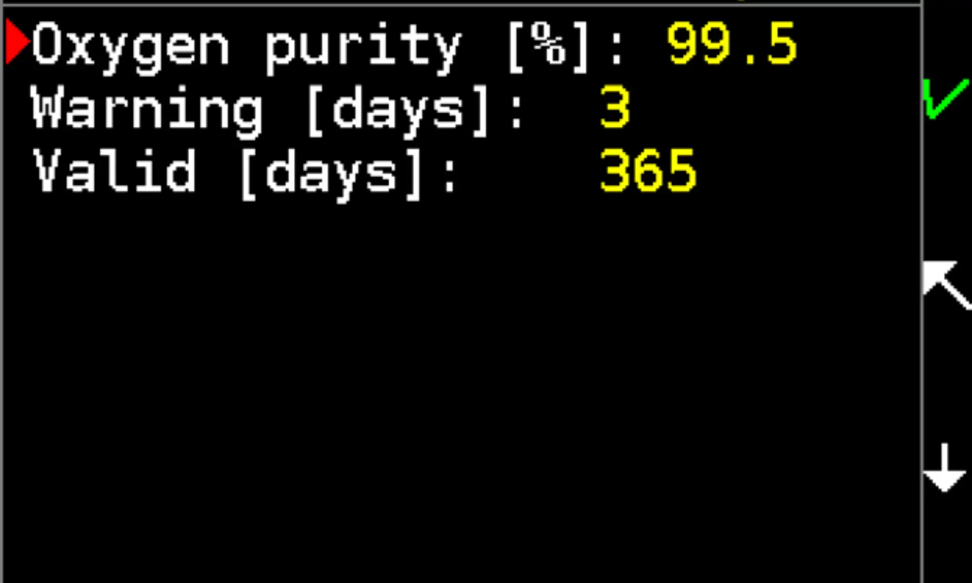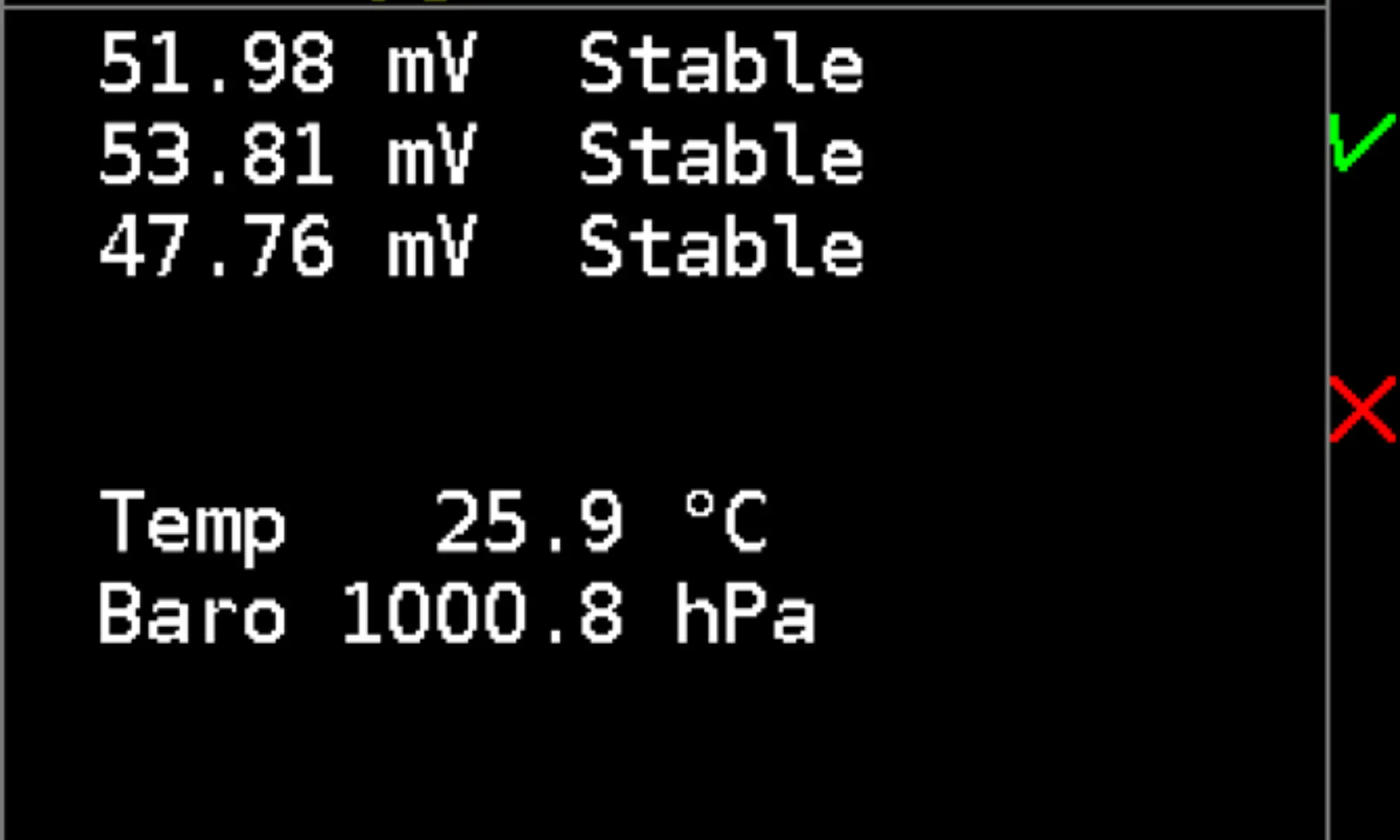 Analyzer can be calibrated with air. Press lower key to start calibration. Confirm calibration with upper key press when mV reading is stable. Old sensor may but may not be detected by low voltage during calibration using air (see the sensor manufacturer’s datasheet). Reliable method is to calibrate the sensor with air and then check the maximum range with pure oxygen. Recalibrate analyzer sensor at least 24 h before measuring. Calibration process takes altitude (atmospheric pressure) and temperature into account. Rebreather sensor calibration has no connection with analyzer sensor calibration.