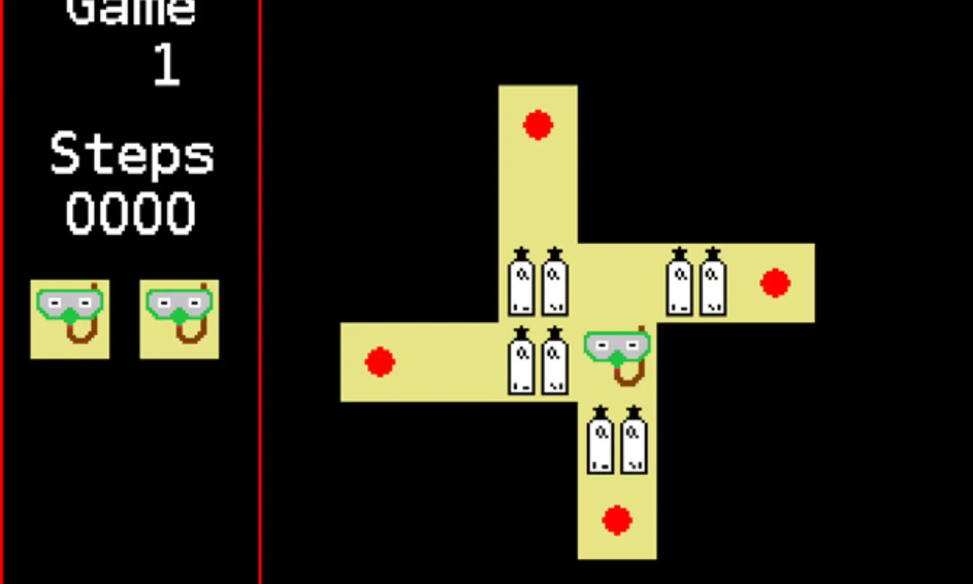 Sokoban is a type of transport puzzle, in which the player (a diving mask with snorkel) pushes tanks or crates around in a warehouse, trying to get them to storage locations (red dots). The game is played on a board of squares, where each square is either a floor or a wall. Some floor squares contain tanks, and some floor squares are marked as storage locations. The player is confined to the board, and may move horizontally or vertically onto empty squares (never through walls or boxes). The player can also move into a tank, which pushes it into the square beyond. Tanks may not be pushed into other tanks or walls, and they cannot be pulled. The puzzle is solved when all tanks are in the storage locations.