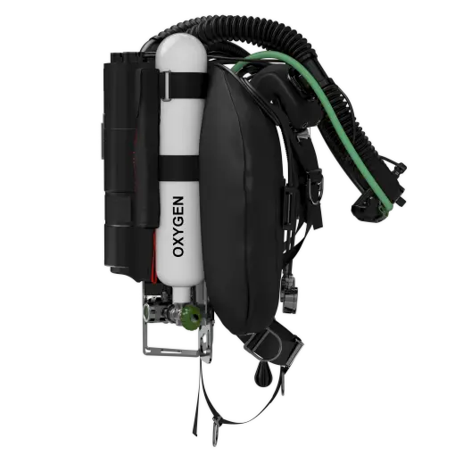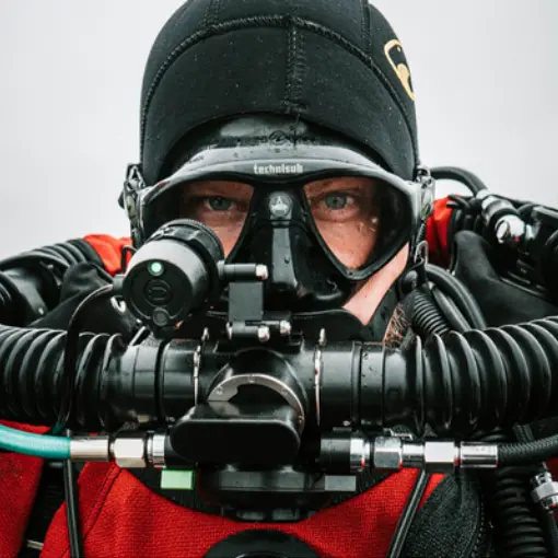 Each is powering each half of the head. USB rechargeable. Easy to exchange. Each battery is insulated to work in extreme environments and has an exhaust valve. In case of gas discharge from within the battery, gas will be vented out into the environment and not into the breathing loop. Battery life: 35+ hours in Dive Mode, up to 11 months in Standby Mode.