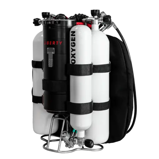 DIR style setup of Liberty rebreather that utilizes any size of onboard cylinders, traditional backplate and a robust wire stand.