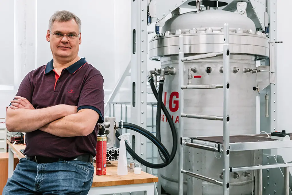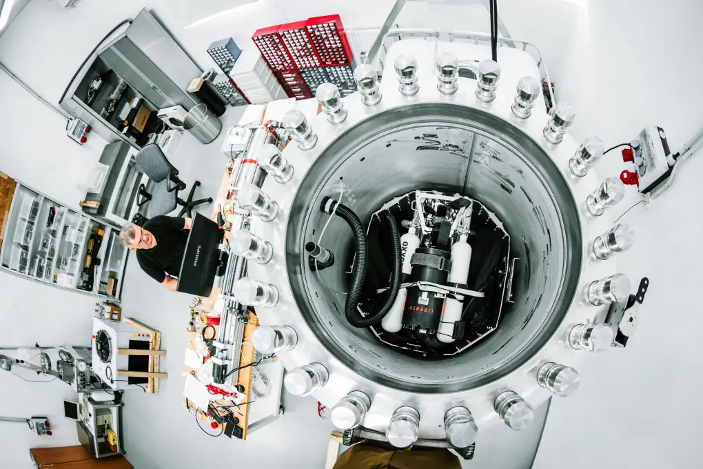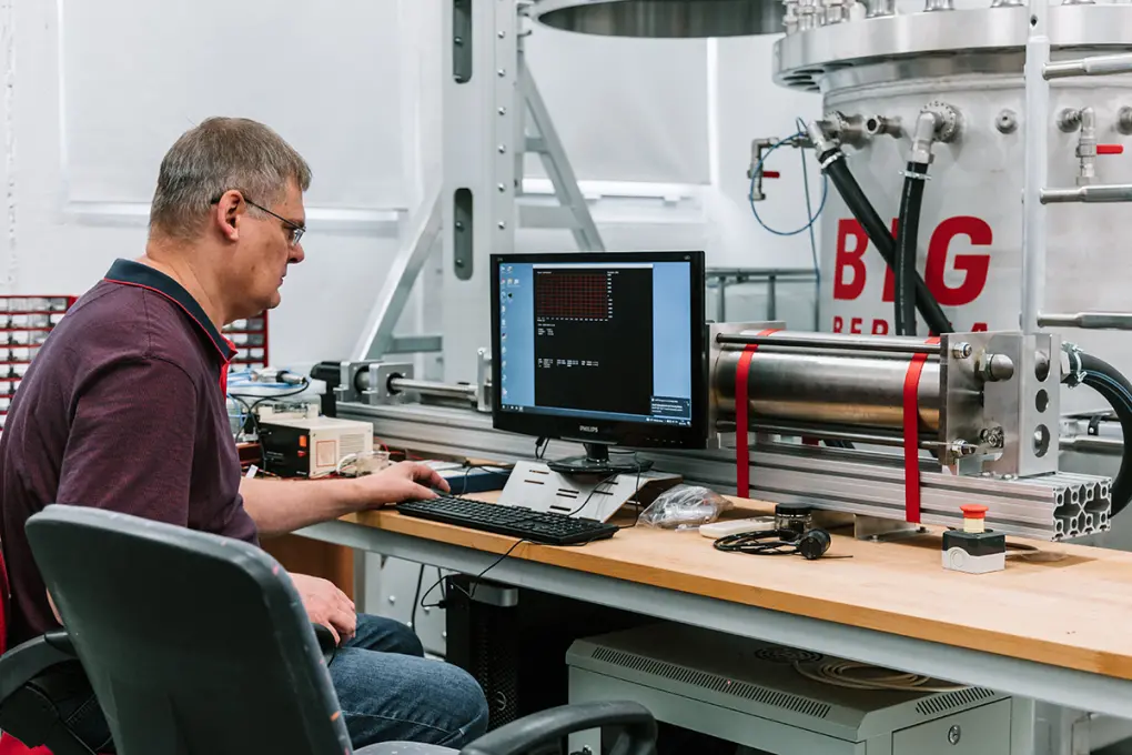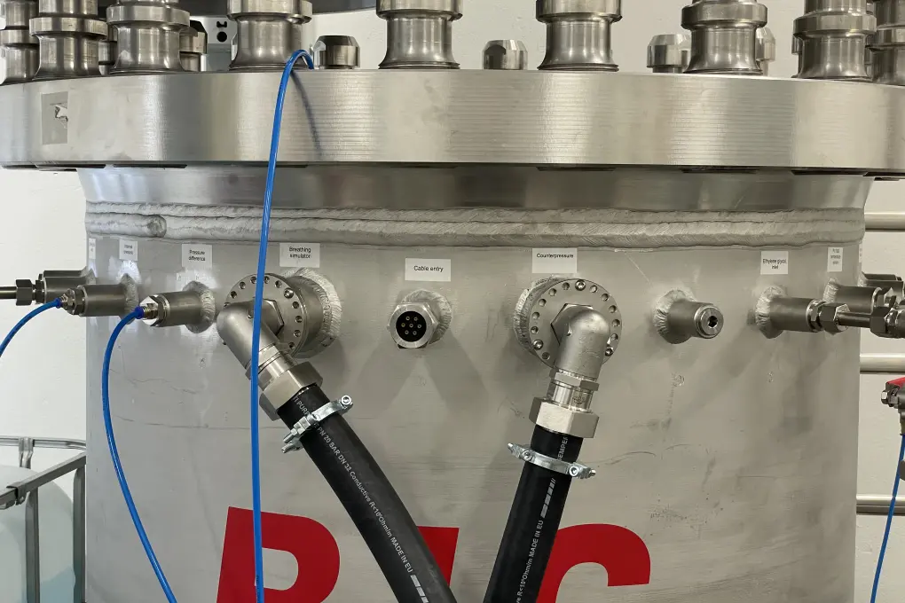 The key component is "Big Bertha", a pressure chamber capable of pressure equivalent of 300m, capable of fitting a whole rebreather unit inside. The unit is mounted on a pivotable mount allowing testing in various positions. The chamber is connected to an electronically controlled breathing machine and various sensors allowing us to test and monitor equipment in extreme conditions including tests in water temperature of 4°C.