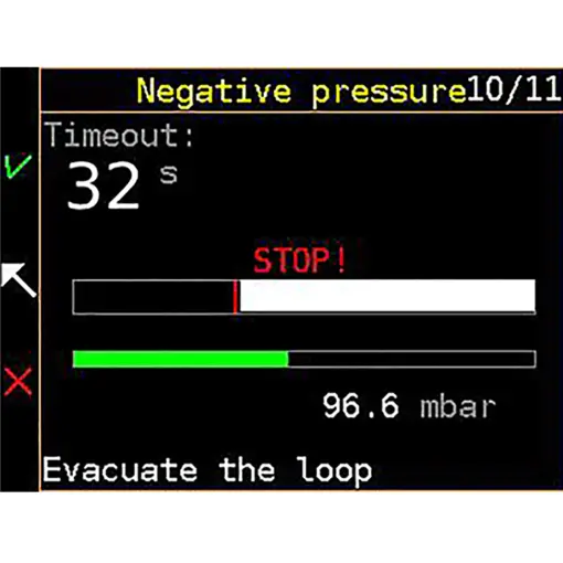 The positive and negative pressure test is done in 1 minute each. This accurately detects any leaks of the breathing loop to prevent flooding. Simply evacuate/inflate the loop until the unit tells you to stop and starts a 60 sec. countdown. You can monitor your actual loop pressure within 0,1 millibar. Assurance that your unit is safe to dive.