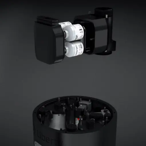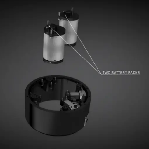 Each is powering each half of the head. USB rechargeable. Easy to exchange. Each battery is insulated to work in extreme environments and has an exhaust valve. In case of gas discharge from within the battery, gas will be vented out into the environment and not into the breathing loop. Battery life: 35+ hours in Dive Mode, up to 11 months in Standby Mode.