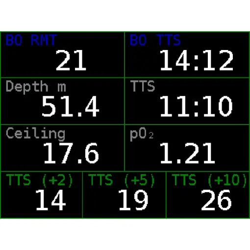 The unit also calculates your Bail Out Remaining Time based on the volume of BO gas that you have available. A vibration reminder will notify you when you are about to reach a point of having just enough BO gas to return back to the surface so you can start heading safely back home. The information about how much longer your TTS would be if you stayed 2, 5, or 10 mins longer at the depth is also available.