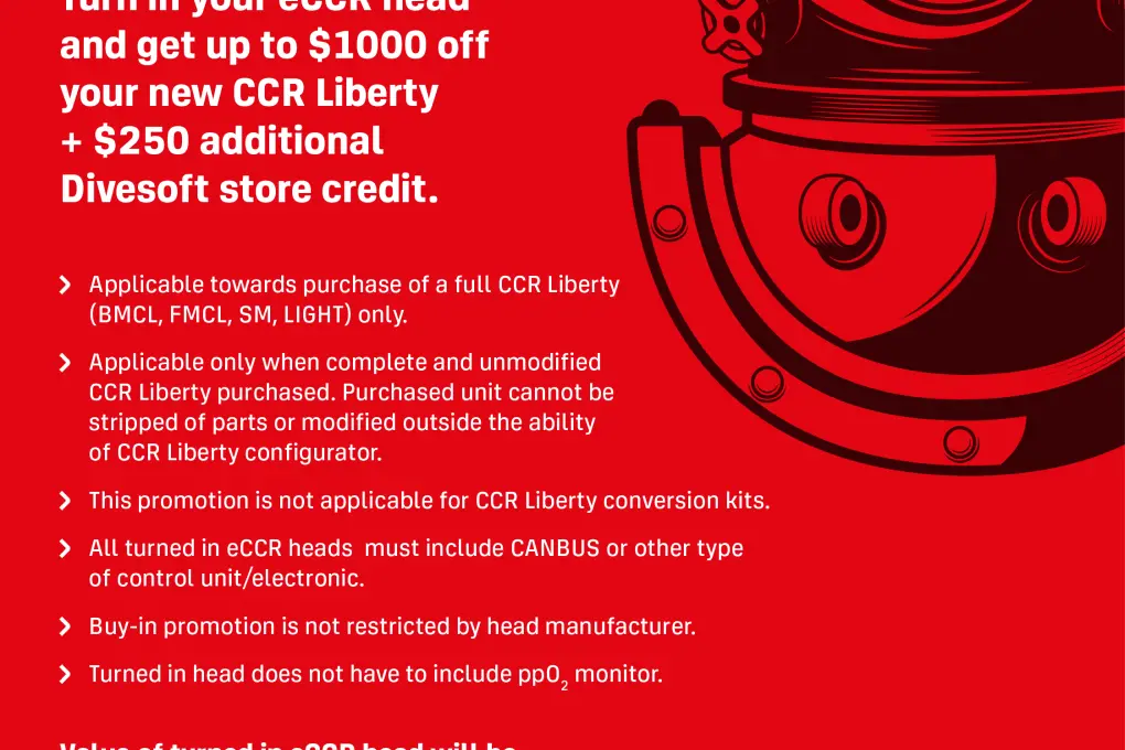 In the case that you own an old eCCR then you can turn in your old eCCR head and get up to $1000 off your new CCR Liberty + $250 additional Divesoft store credit.