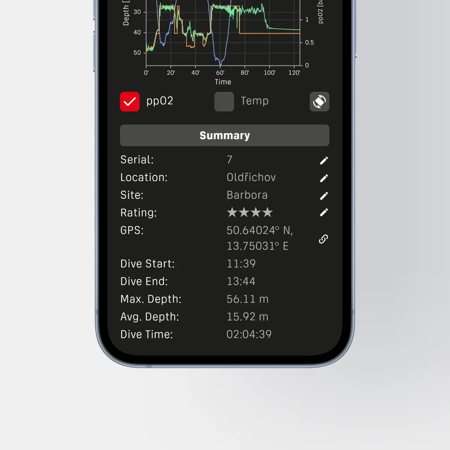 Depth profiles, dive time and key parameters displayed in a clean visual format.